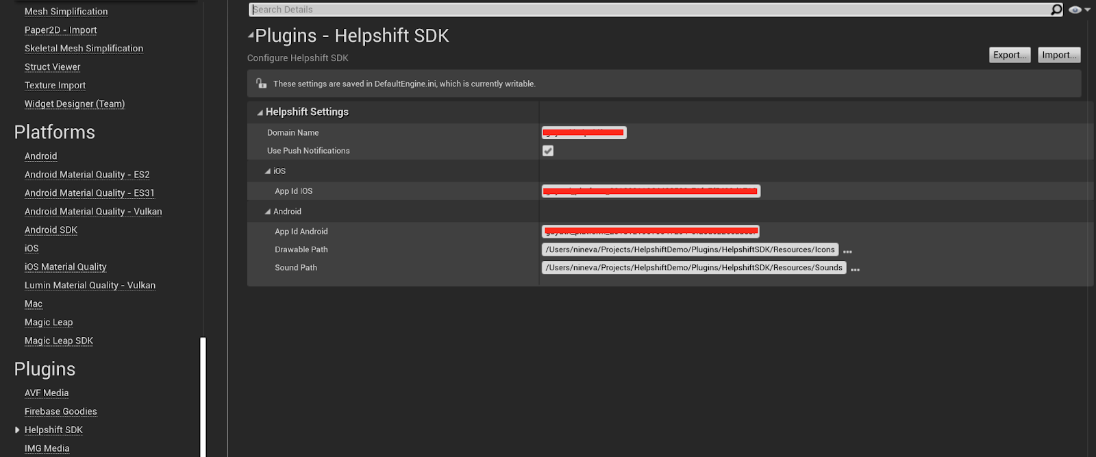 plugin(HelpshiftSDK) directory into[YOUR_PROJECT]/Pluginsdirectory - After that, once you reopen your project, the plugin should appear in the Plugins section