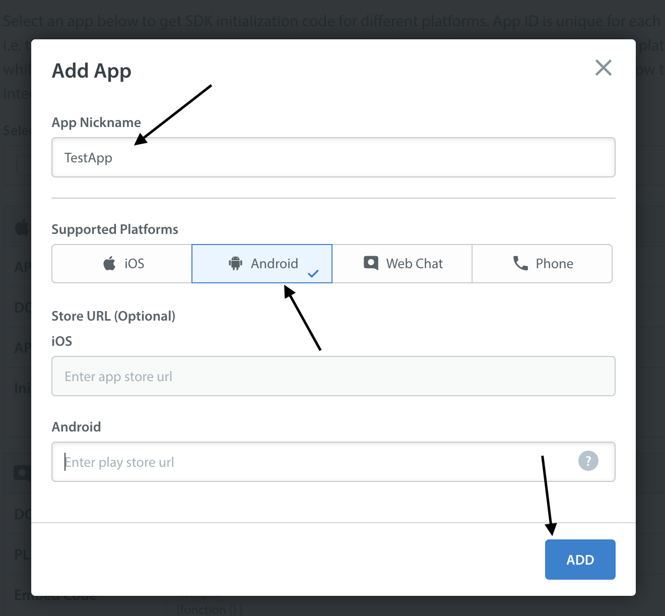 To enable the Helpshift system to send push notifications to your users you will have to add an Android as a platform in your app (if you have not added already).