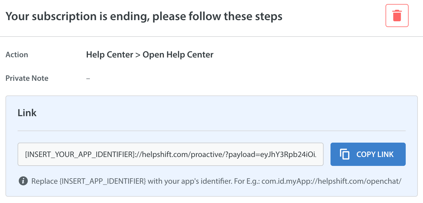 handleProactiveLink(link).We will read the data from the link you provided and open Helpshift support with the configurations you provided from outbound support dashboard.
